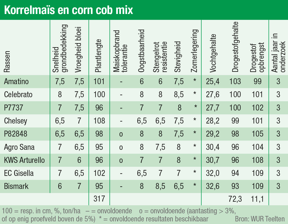 Bij de korrelmais en corn cob mix (CCM)-rassen gooit Genialis hoge ogen door zowel op oogstbaarheid, stengelrotresistentie en stevigheid een 8,5 te scoren. Sommige andere rassen scoren op een van die kenmerken. Daarbij is dit het enige ras dat zeer goed scoort op maiskopbrandtolerantie, op basis van drie jaar onderzoek. Bij drogestofopbrengst in de korrel zijn debutanten EG Gisella en Bismark de toppers met 109.