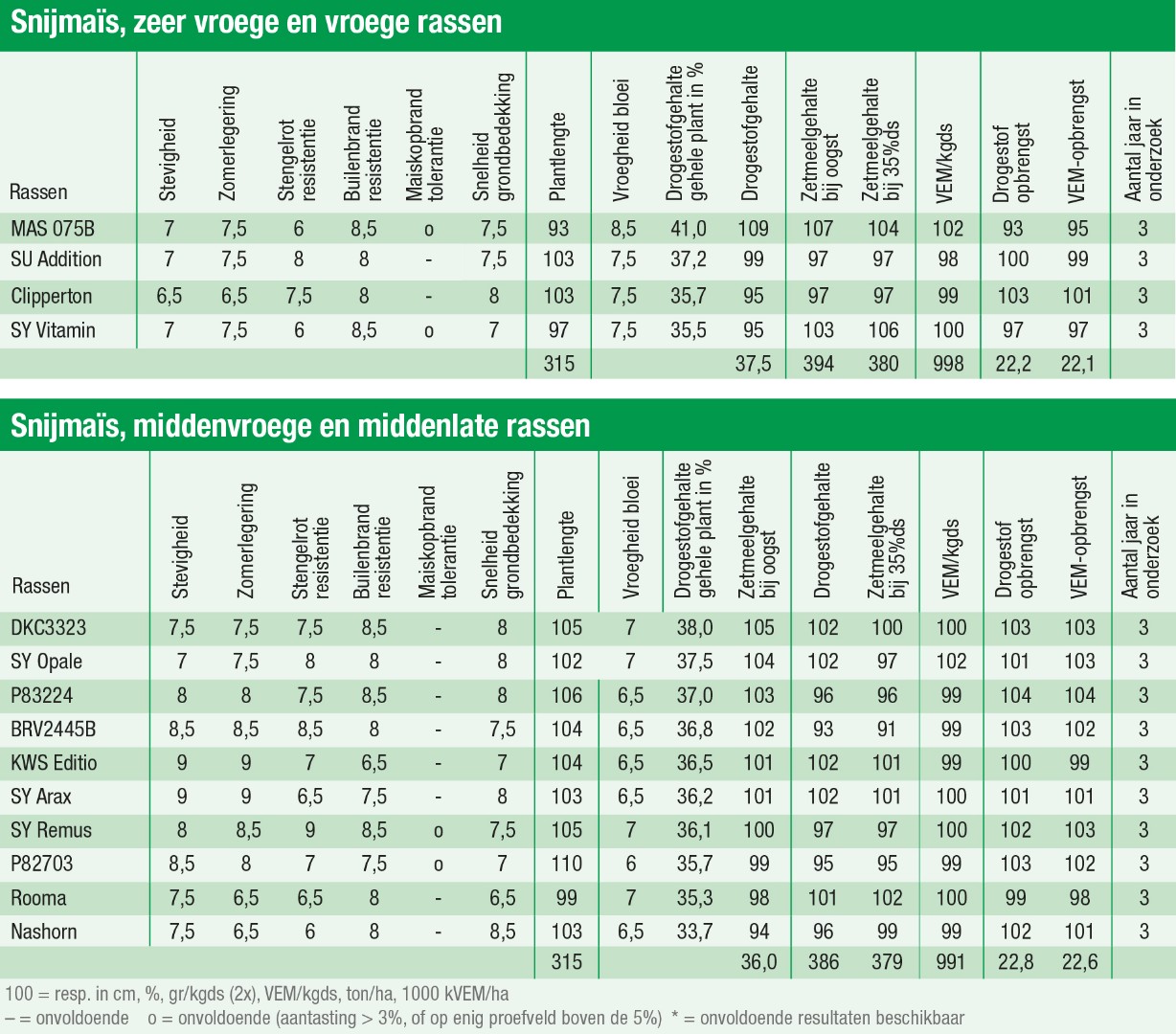 Wat de drogestofgehalten betreft zijn LG32.257, Meluseen en Luxury met 108 de toppers. LG32.257 scoort met 108 het hoogst in zetmeelgehalte bij de oogst. Debutant P83224 is met 104 de beste op het vlak van VEM-opbrengst.