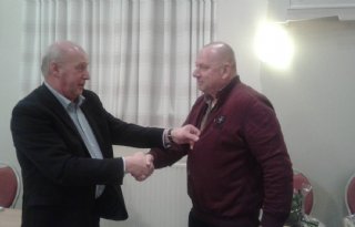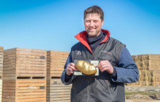 Johannes van Heerwaarden kreeg maandagavond op de afdelingsavond van LTO Noord KAVB Texel uit handen van Peter Boutkan de Gouden aardappel uitgereikt.