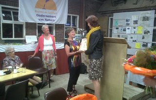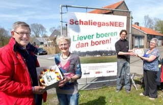 Mechanisatiebedrijf Naaktgeboren in Tollebeek kreeg vanmiddag het honderdste spandoek uitgereikt dat zich uitspreekt tegen het boren naar schaliegas in de Noordoostpolder (NOP).