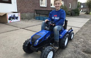 De traptrekker van New Holland is gewonnen door Joep Willems uit het Limburgse Leunen. De zevenjarige Joep deed een paar weken geleden mee aan de kleurplatenwedstrijd van Nieuwe Oogst en won de eerste prijs. Nu moet de trekker natuurlijk nog wel in...