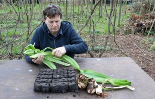 Tom Bade van Bureau Triple E en Ron Evers van Bloemenkwekerij Evers deden een succesvolle proef om afvalbladeren van de amaryllis samen met mycorrhiza en rivierslib tot substraatmateriaal voor de boomkwekerij te verwerken.