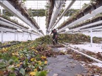 22-02-2018 - Het lijkt wel herfst in de kas van van Royal Berry bij Bemmel lijkt het wel herfst. De medewerkers van het bedrijf zijn bezig om het oude najaarsgewas op te ruimen, door het blad af te...