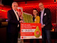 07-12-2017 - CliniClowns mocht vandaag een cheque ter waarde van 14.875 euro in ontvangst nemen uit handen van Migo. Dat is een perenras dat wordt geleverd door FruitMasters.