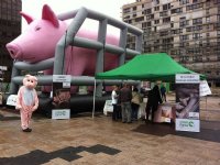 08-11-2013 - Een varken, zo hoog als een huis, staat dinsdag op de Dam in Amsterdam als protest tegen ‘illegale praktijken’ in de Europese en Nederlandse varkenshouderij.
