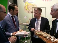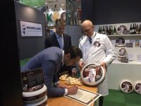 15-01-2016 - Tijdens de Grüne Woche in Berlijn heeft staatssecretaris Martijn van Dam (EZ) de eerste Hollandse Geitenkaas met zegel van de Europese Unie (EU) in ontvangst genomen.
