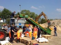 11-06-2013 - Waterschap Hunze en Aa's leert Duitsers werken met de zandzakvulmachines bij de Elbe, onder Hamburg. Het team is gisteren aangekomen in Duitsland om de dijken te verstevigen.