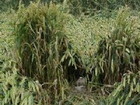 15-07-2015 - Door de vele regen en harde wind is het wintertarweperceel van akkerbouwer Hans Haanstra in Dronten platgeslagen. In de wintertarwe zit een nest jonge grauwe kiekendieven.