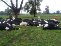 09-04-2014 - Tijdens noodweer in het zuiden van Chili heeft de bliksem op een boerderij 55 koeien gedood. De schade is minstens 72.000 euro, meldt de Chileense krant El Mercurio.