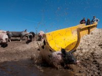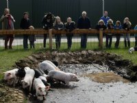 07-08-2013 - De glijbaan in de varkensweide van Piggy's Palace, bij varkenshouder Erik Stegink, waarvan Nieuwe Oogst dit weekeinde als eerste melding maakte, heeft massale media-aandacht getrokken.