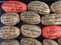 18-03-2016 - Potato Parcel in Californië verstuurt aardappelen waar een persoonlijk bericht op staat. Het bedrijf maakte in de maand februari een omzet van 25.000 dollar, een slordige 22.000 euro.