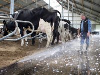 22-04-2016 - Om valpartijen op de emissiearme vloer te voorkomen, monteerde familie Aarts uit Hallum roostersproeiers in hun nieuwe stal.