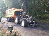 12-10-2015 - Een trekker ging zaterdag in vlammen op aan de Maashorstlaan in Nistelrode. Het voertuig vloog mogelijk spontaan in brand en brandde volledig uit. De aanhanger bleef enigszins gespaard.