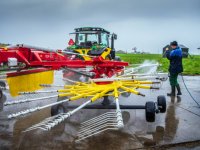 Friese boer spuit harken schoon voor eerste grasoogst