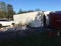 20-04-2016 - De A2 van Maastricht naar Eindhoven is bezaaid met melkpakken. Dat gebeurde woensdagochtend nadat een vrachtwagen daar kantelde en de lading verloor.