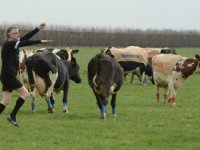 21-03-2014 - Tv-presentatrice Lieke van Lexmond, bekend van Everybody Dance Now, liet gisteren de koeien van melkveehouder René Ebbelaar in Westzaan voor het eerst dit jaar naar buiten.