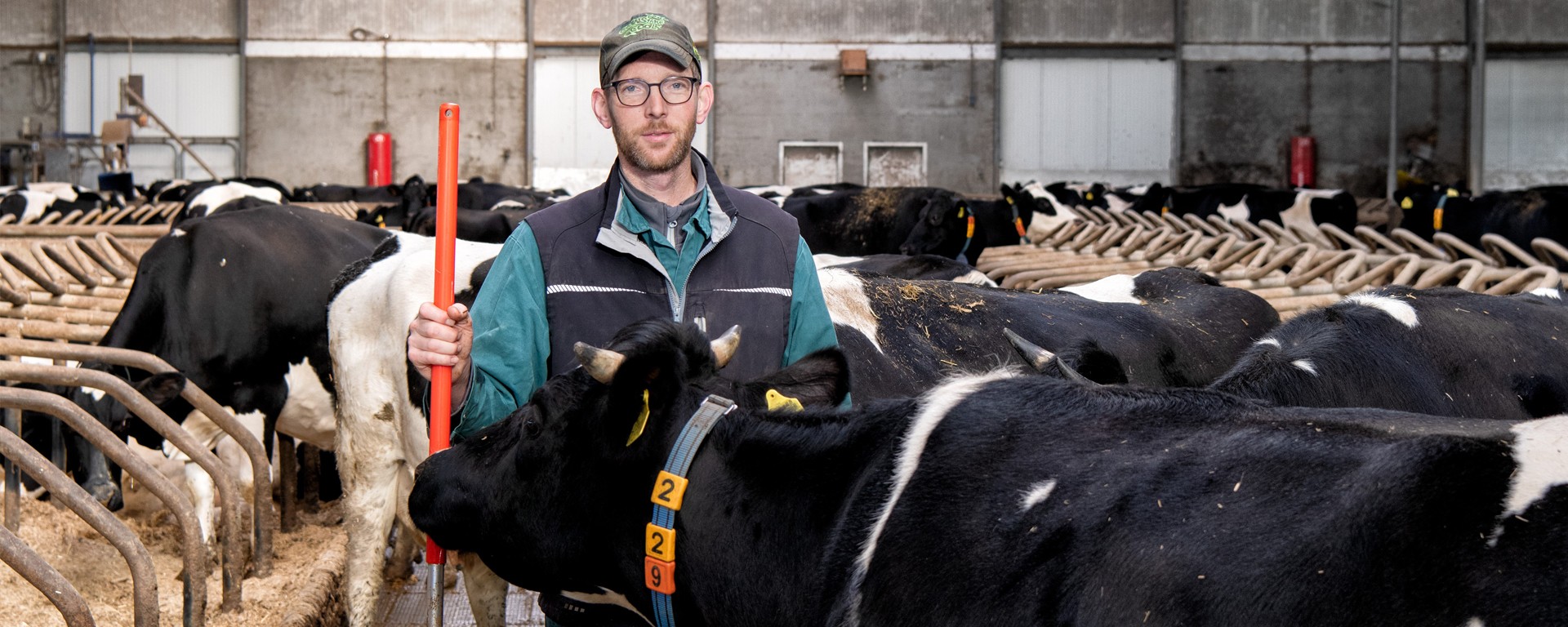 Fotograaf Kees Muizelaar maakte voor het eindejaarskatern Boeren in roerige tijden een foto van biologisch melkveehouder Christian Winden tussen de koeien in zijn stal in het Noord-Brabantse Almkerk. Winden wordt niet vrolijk van de regelgeving, maar maakt zich niet te druk. 'Doe op je bedrijf waar je blij van wordt. Dat geeft niet alleen werkplezier, het bedrijf draait ook beter', zegt hij.